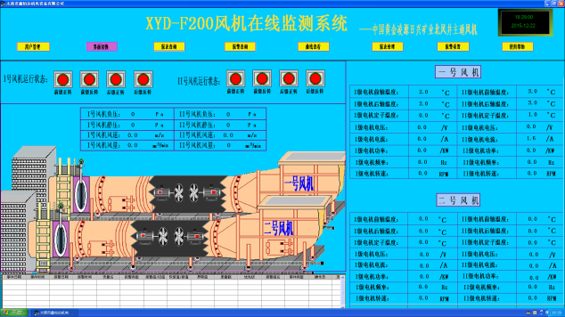 该系统主要用来监测风机的风压、风量、风速、轴承温度、轴承振动、电流、电压、功率、环境温度、环境湿度、瓦斯浓度、CO浓度、风机开停、风门开闭等通风机主要运行参数和运行状态;并可实现风机的远程启停控制及无人值守自动运行。
